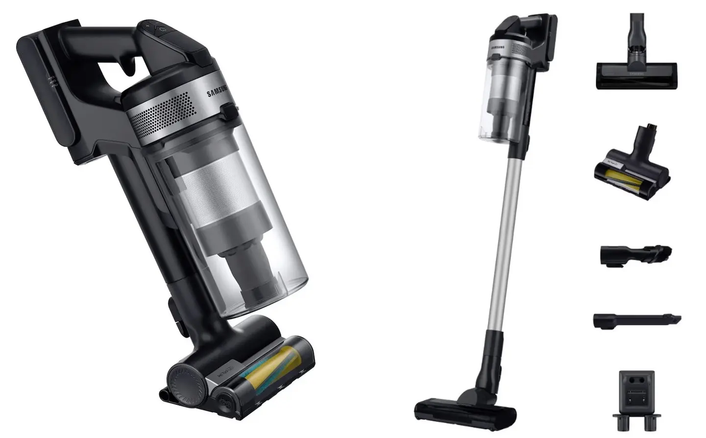Med Samsung Jet 65 Pet medfølger forskelligt tilbehør, der øger dens alsidighed. Jet Fit Brush er designet til effektivt at opsamle støvpartikler fra både tæpper og hårde gulve, og dens 180-graders drejehoved gør det nemt at komme rundt i hjørner. Det særlige kæledyrsværktøj er uundværligt for kæledyrsejere, da det effektivt opsamler selv de fineste dyrehår fra møbler og tekstiler. Et langt sprækkeværktøj og et kombinationsværktøj udvider rengøringsmulighederne til trange steder og mange overflader.
