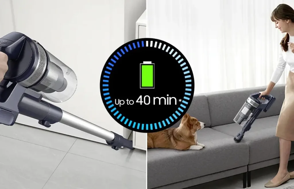 Samsung Jet 65 Pet har en driftsautonomi på op til 40 minutter ved brug på laveste effektindstilling med ikke-motoriseret tilbehør. Batteriet kan udskiftes for at forlænge rengøringstiden.